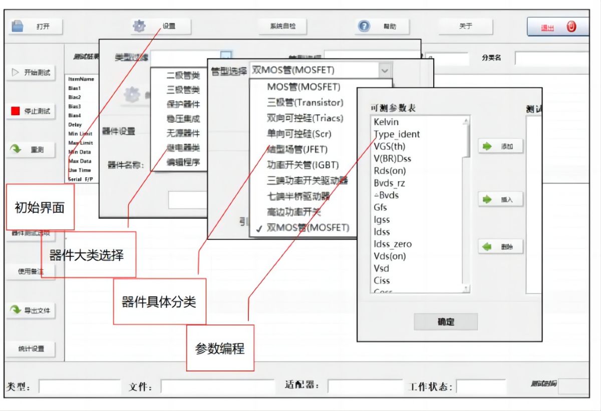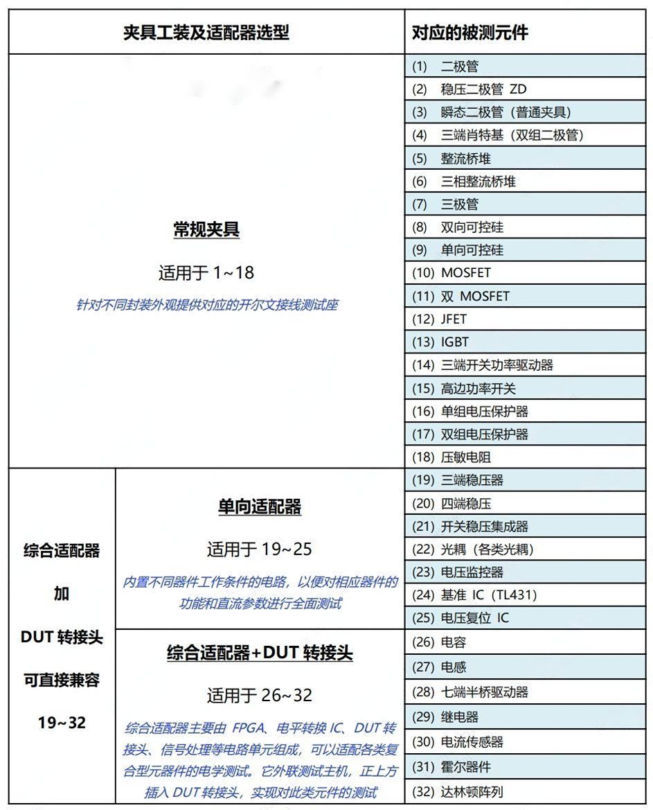 測(cè)試種類(lèi)覆蓋 7 大類(lèi)別26分類(lèi),包括“二極管類(lèi)”“三極管類(lèi)(如BJT、MOSFET、IGBT)”
